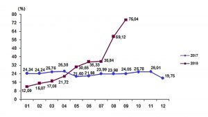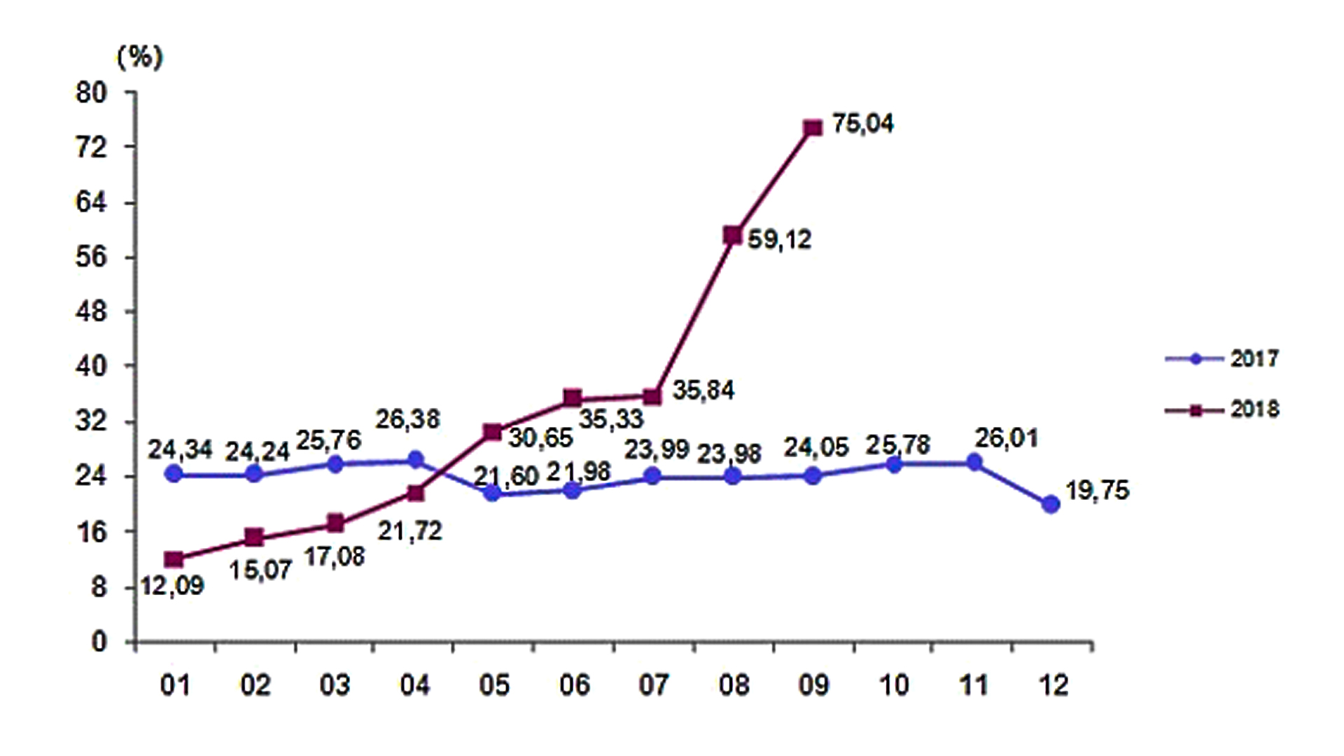 Ülke sınırları içinde üretimi yapılarak yurt dışına ihraç edilen malların üretici fiyatlarındaki değişimi ölçen yurt dışı üretici fiyat endeksi (YD-ÜFE), 2018 yılı Eylül ayında bir önceki aya göre %10,14, bir önceki yılın Aralık ayına göre %59,58, bir önceki yılın aynı ayına göre %75,04 ve on iki aylık ortalamalara göre %31,44 artış gösterdi.