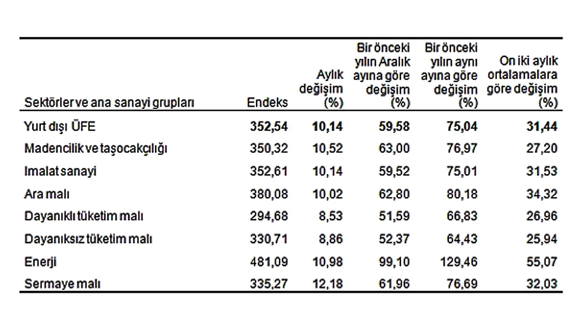 Bir önceki aya göre en fazla artış; %12,95 ile motorlu kara taşıtları, treyler (römork) ve yarı treyler (yarı römork), %12,62 ile diğer madencilik ve taşocakçılığı ürünleri, %11,98 ile tütün ürünleri sektöründe gerçekleşti.