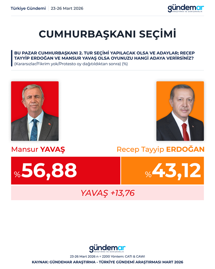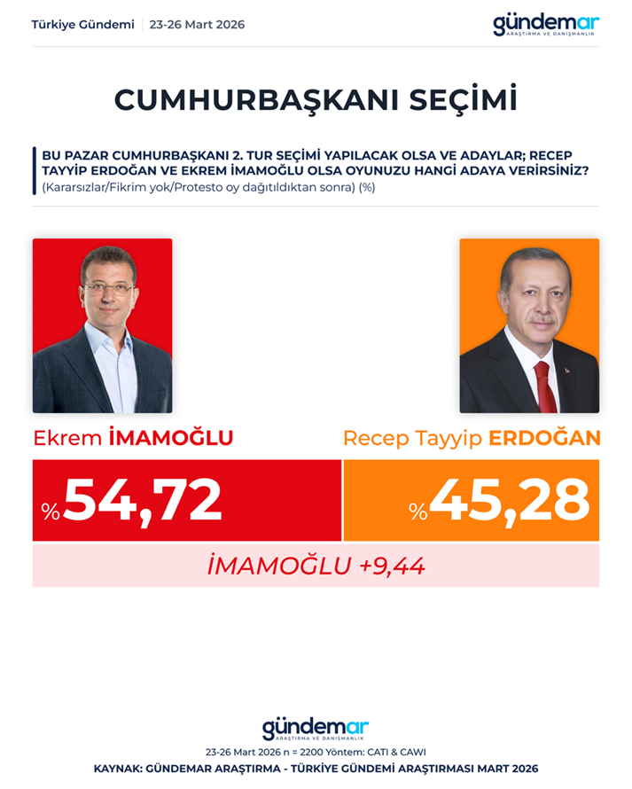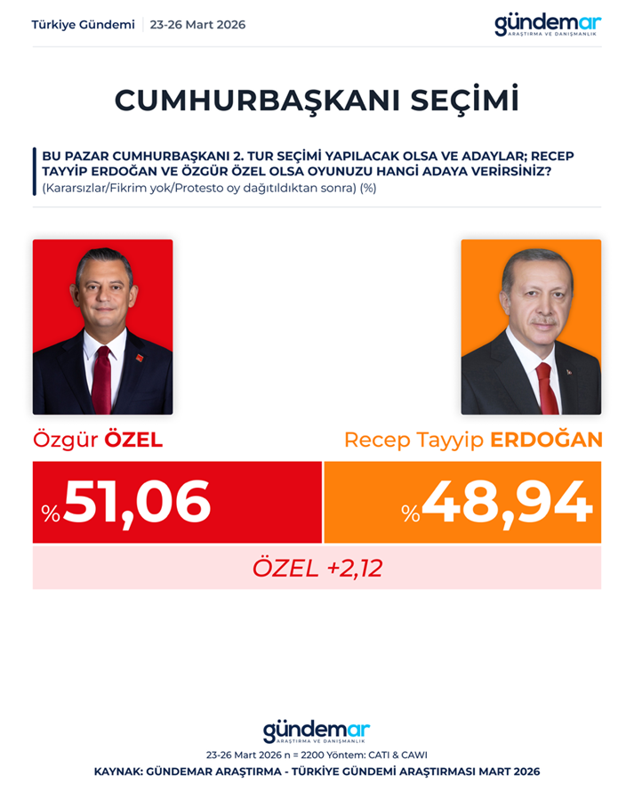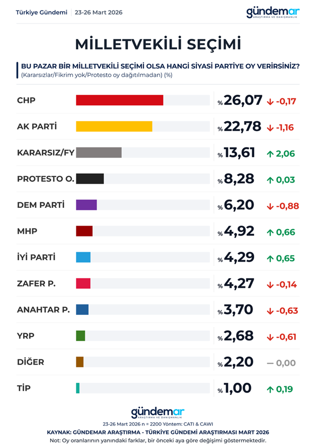GÜNDEMAR Araştırma’nın 23-26Mart 2026 tarihleri arasında 2.200 kişiyle gerçekleştirdiği Türkiye Gündemi Araştırması’na göre, kararsızlar, fikrim yok ve protesto oyların oransal olarak dağıtılmasının ardından CHP yüzde 33,37 ile birinci parti konumunu koruyor. AK Parti yüzde 29,16 ile ikinci sırada yer alırken; DEM Parti yüzde 7,94, MHP yüzde 6,30, İYİ Parti yüzde 5,49,Zafer Partisi yüzde 5,47, Anahtar Parti yüzde 4,74, Yeniden Refah Partisi yüzde 3,43, Diğer Partiler yüzde 2,82 ve TİP yüzde 1,28 oranında destek alıyor.